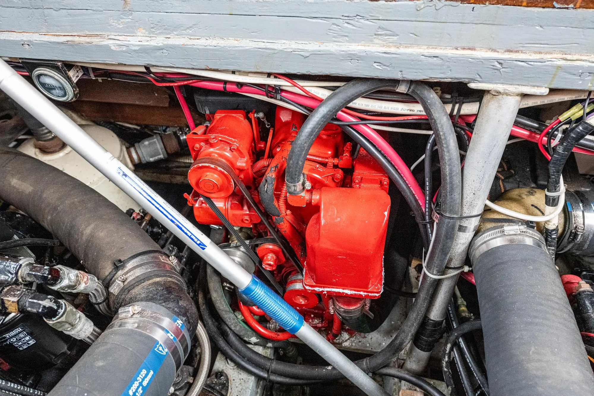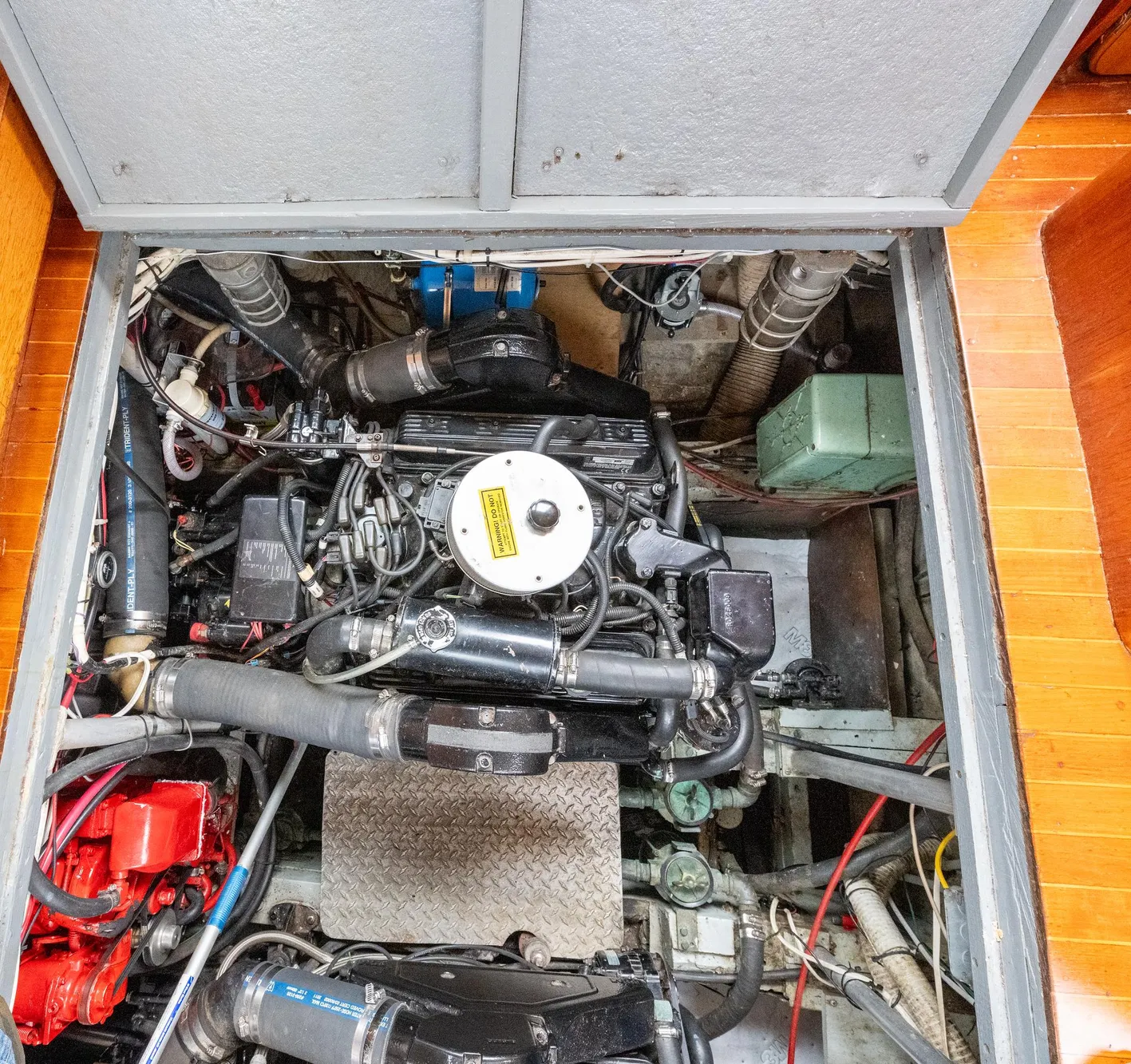 Twin Chevy 350 CID 8 cylinder 280 hp fresh water cooled gas engines, installed 2000 with only about 600 hours clocked since. Velvet Drive tranny to 1 3/8" bronze shafts with four bronze struts, bronze rudders and props.