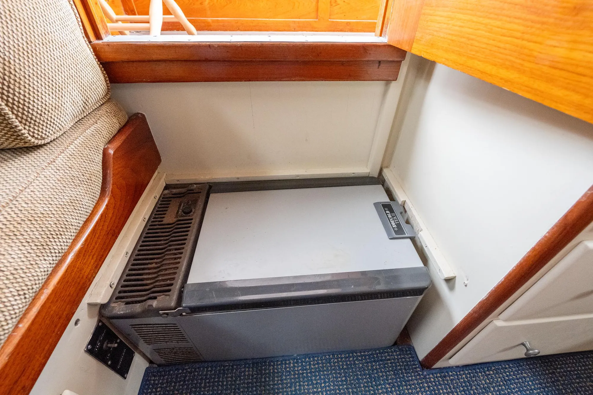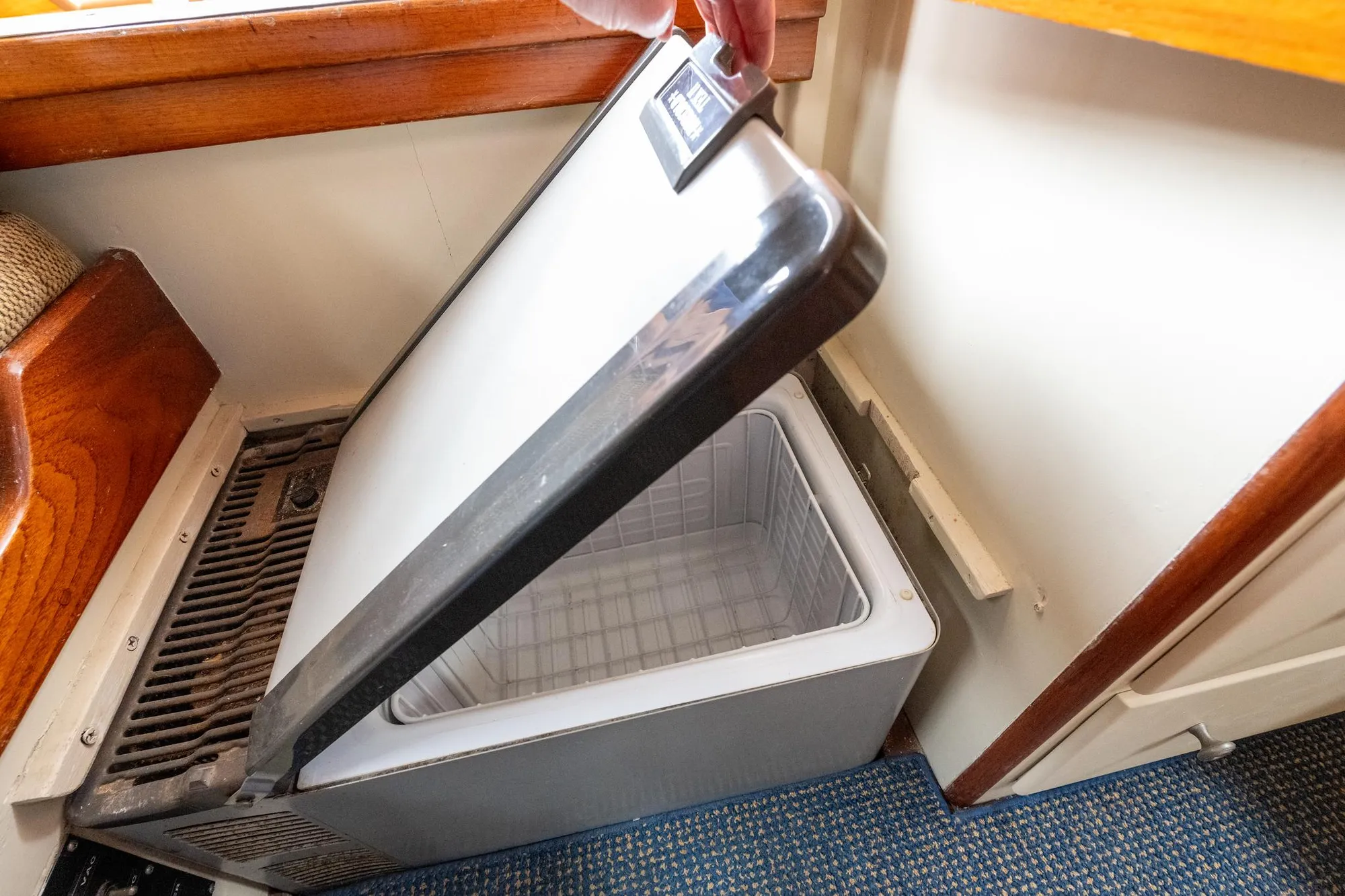 Stainless steel sink, cold plate refrigeration, two burner LPG stove. Manual pump toilet with Lectrosan system