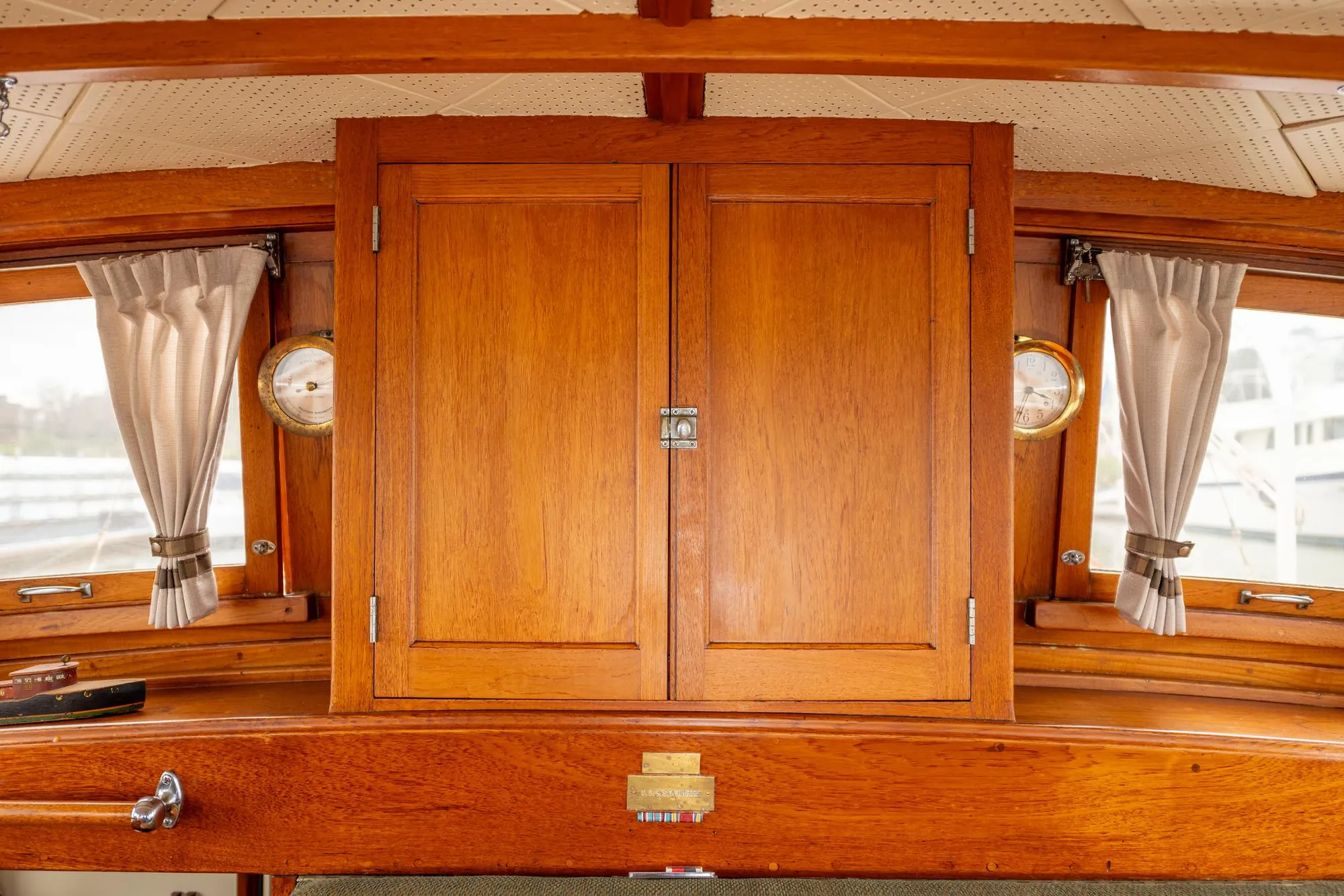 After being shipped back to California and mustered out of the Navy, she was Theo Stephens personal yacht for many years--and being the personal boat of the boatyard owner meant that whenever there was a lull in production the crew worked on her. As well as benefiting from knowledgeable owners since new, she's also been kept either in a covered berth (at Willow Berm for decades) or under a full boat cover her entire life (currently under an $18,000 marvel built by Sausalito Canvas Works).
