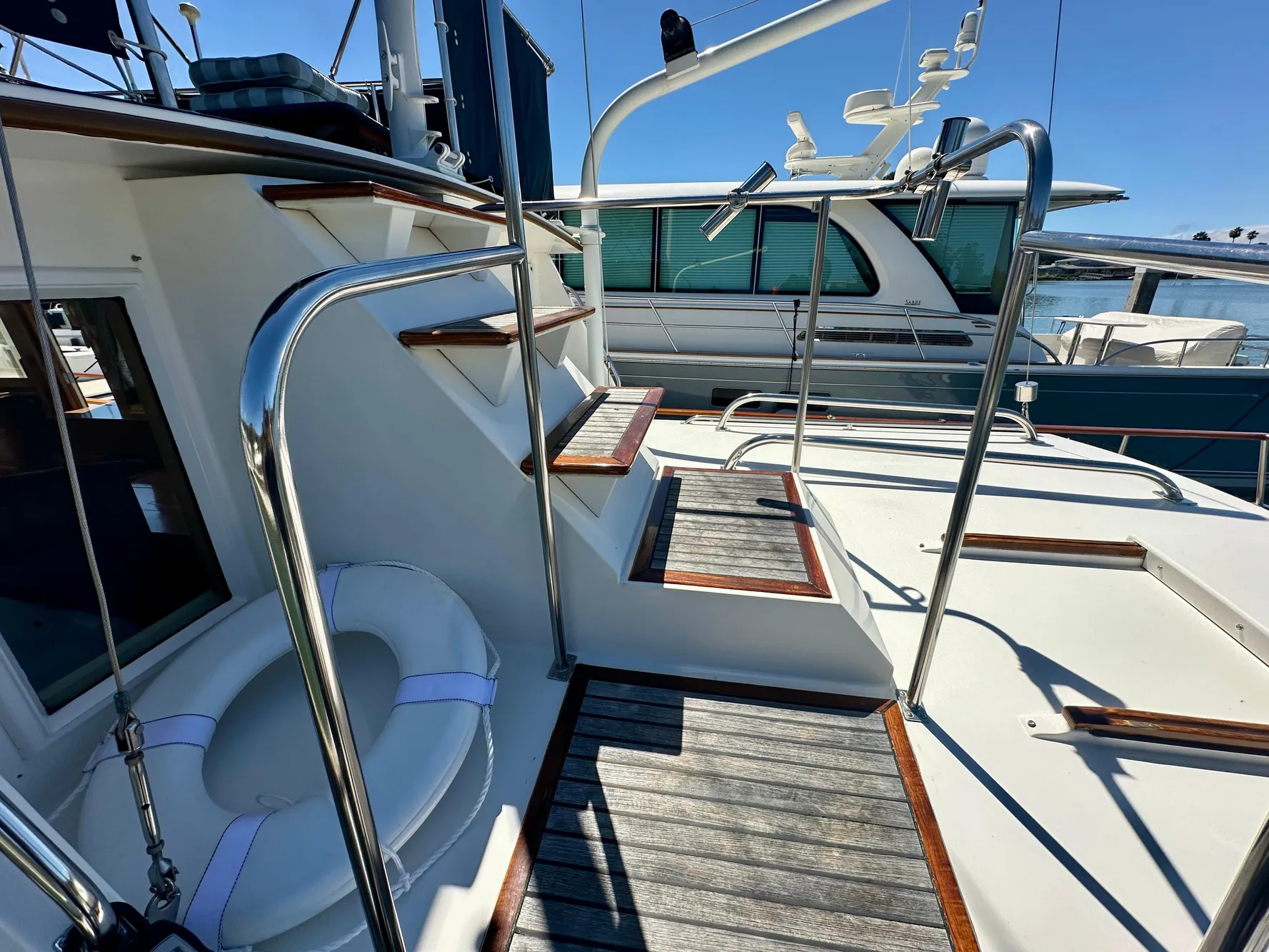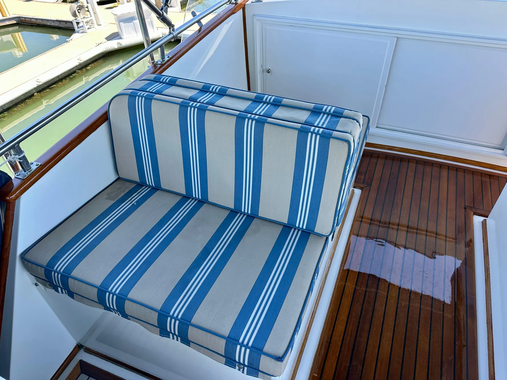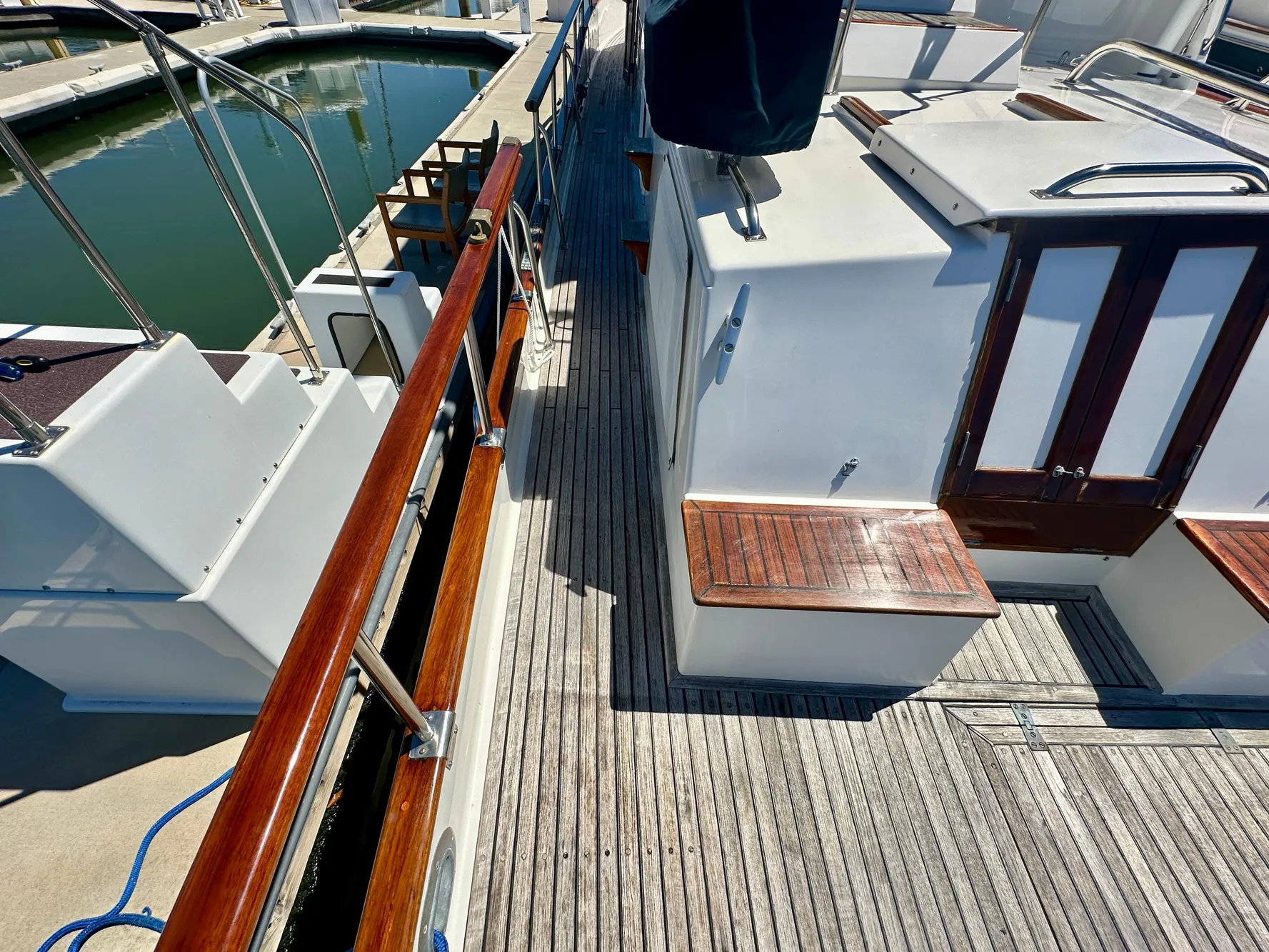 - Upgraded teak swim step with telescoping swim ladder