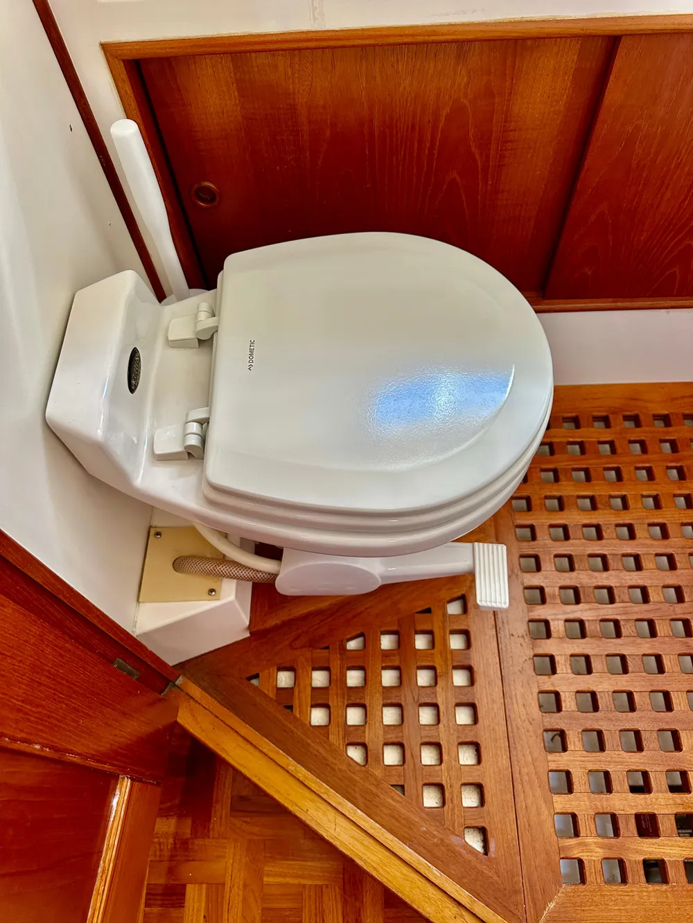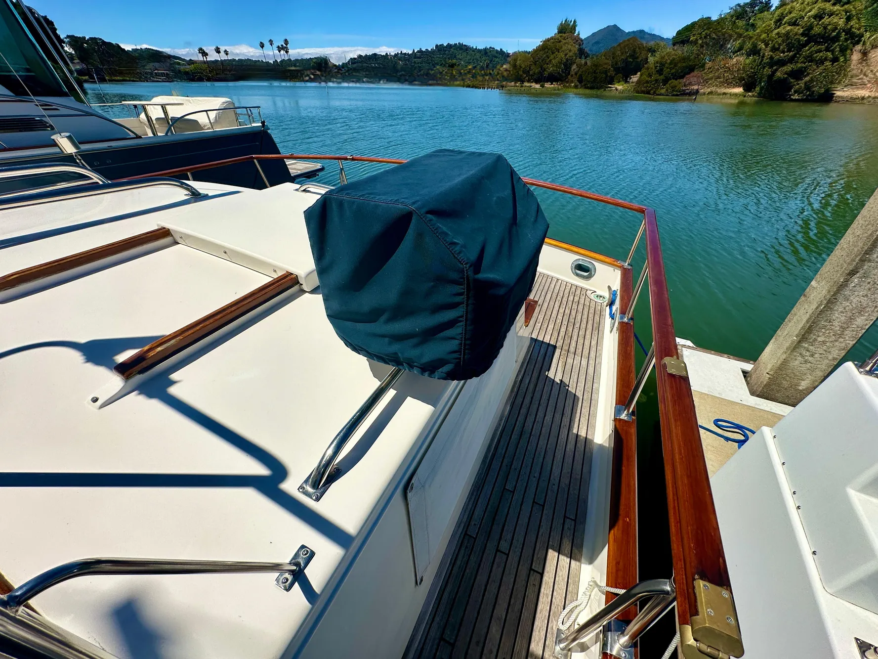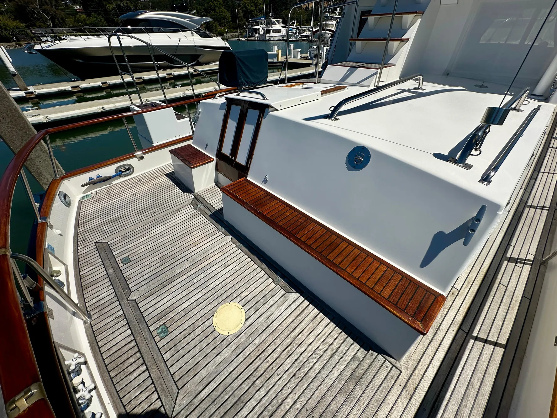 - Upgraded teak swim step with telescoping swim ladder