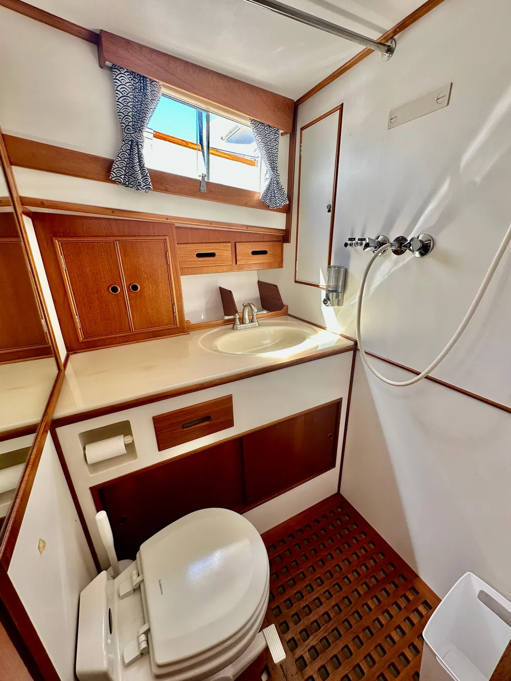 The guest stateroom is forward with V-berth plus filler cushion, teak lined hanging locker and a private head and shower. Both heads have upgraded faucets, sinks with Corian countertops, mirrors w/teak frame, showers with teak grating, and Vacuflush heads.