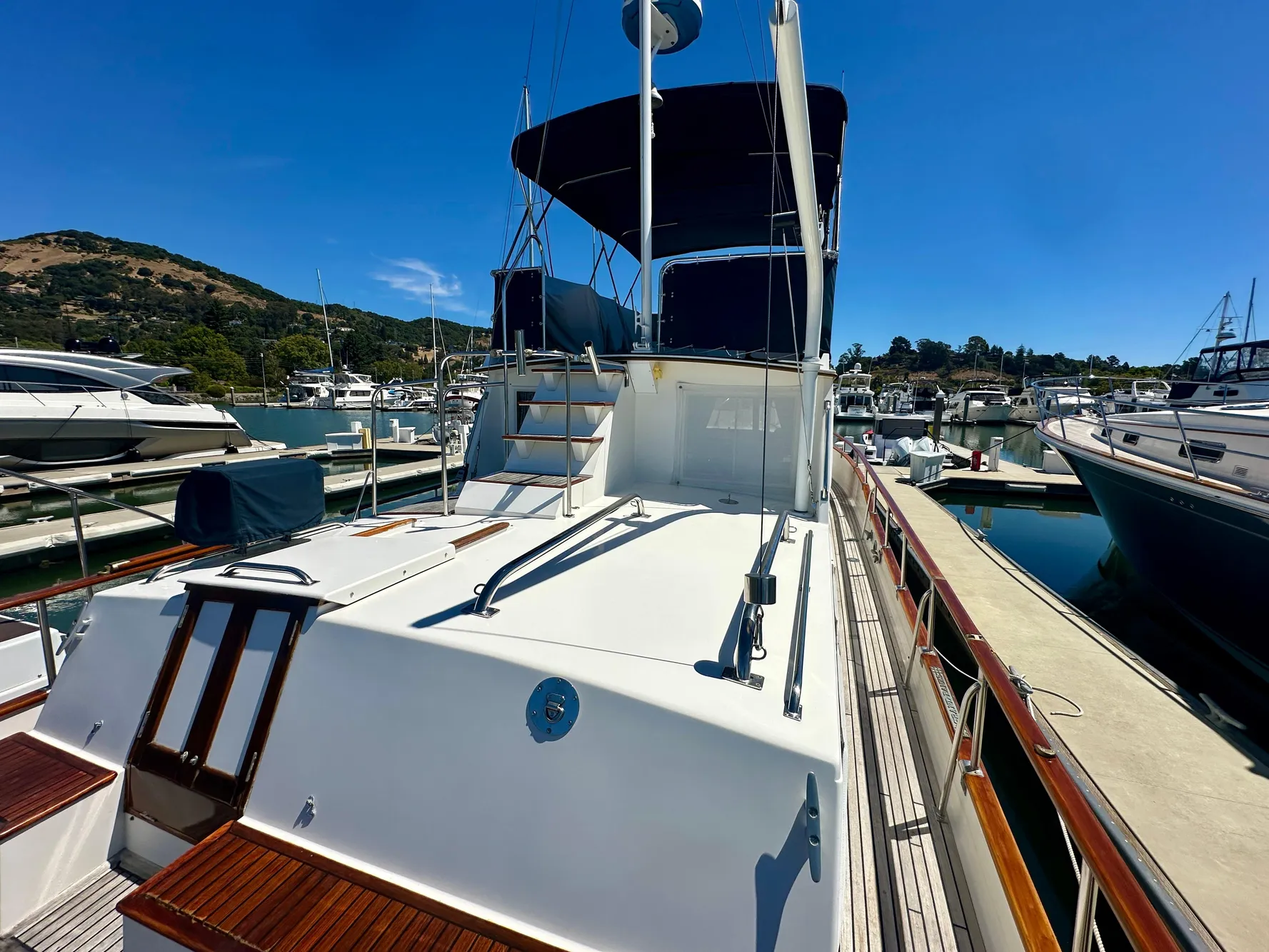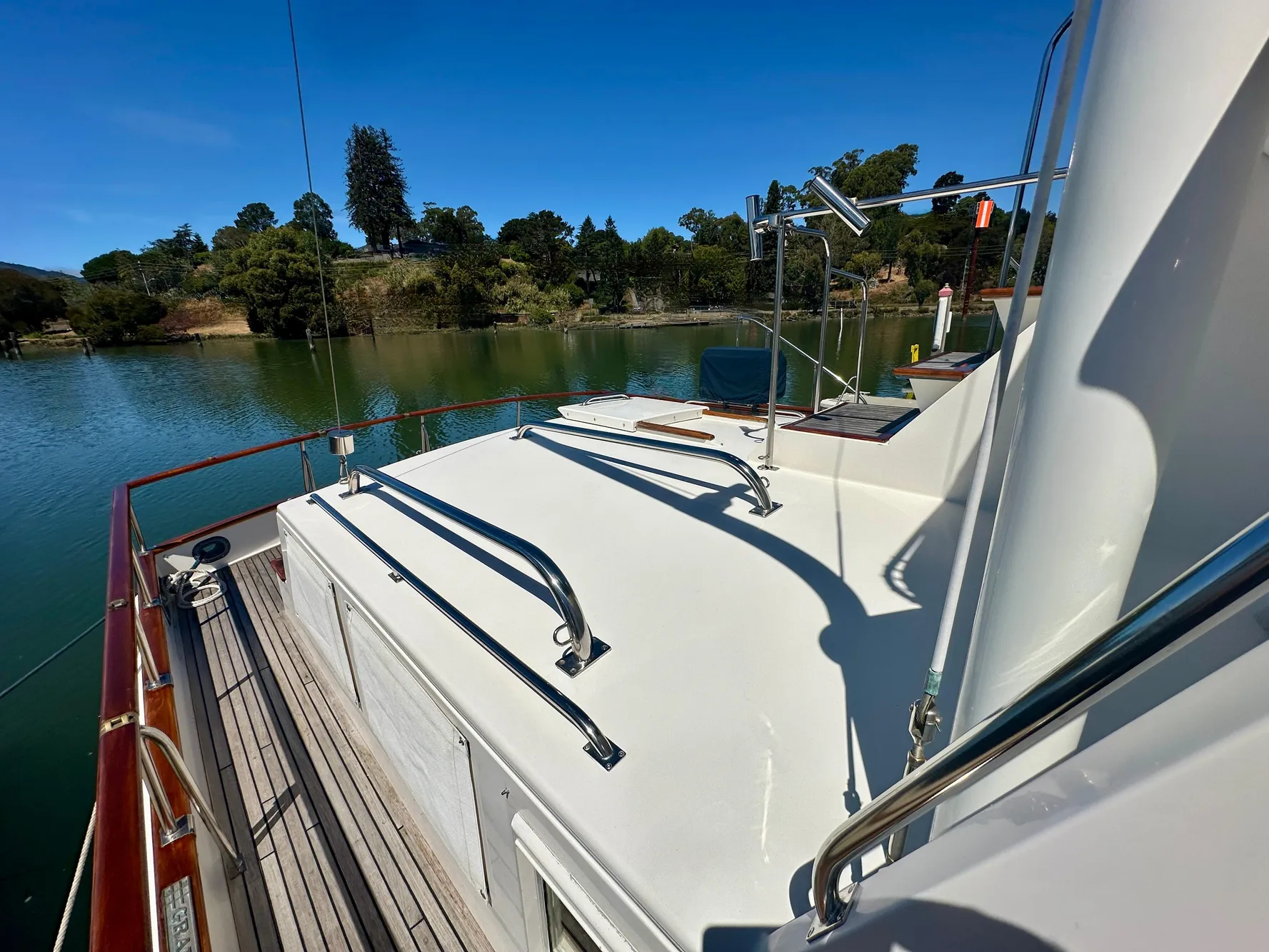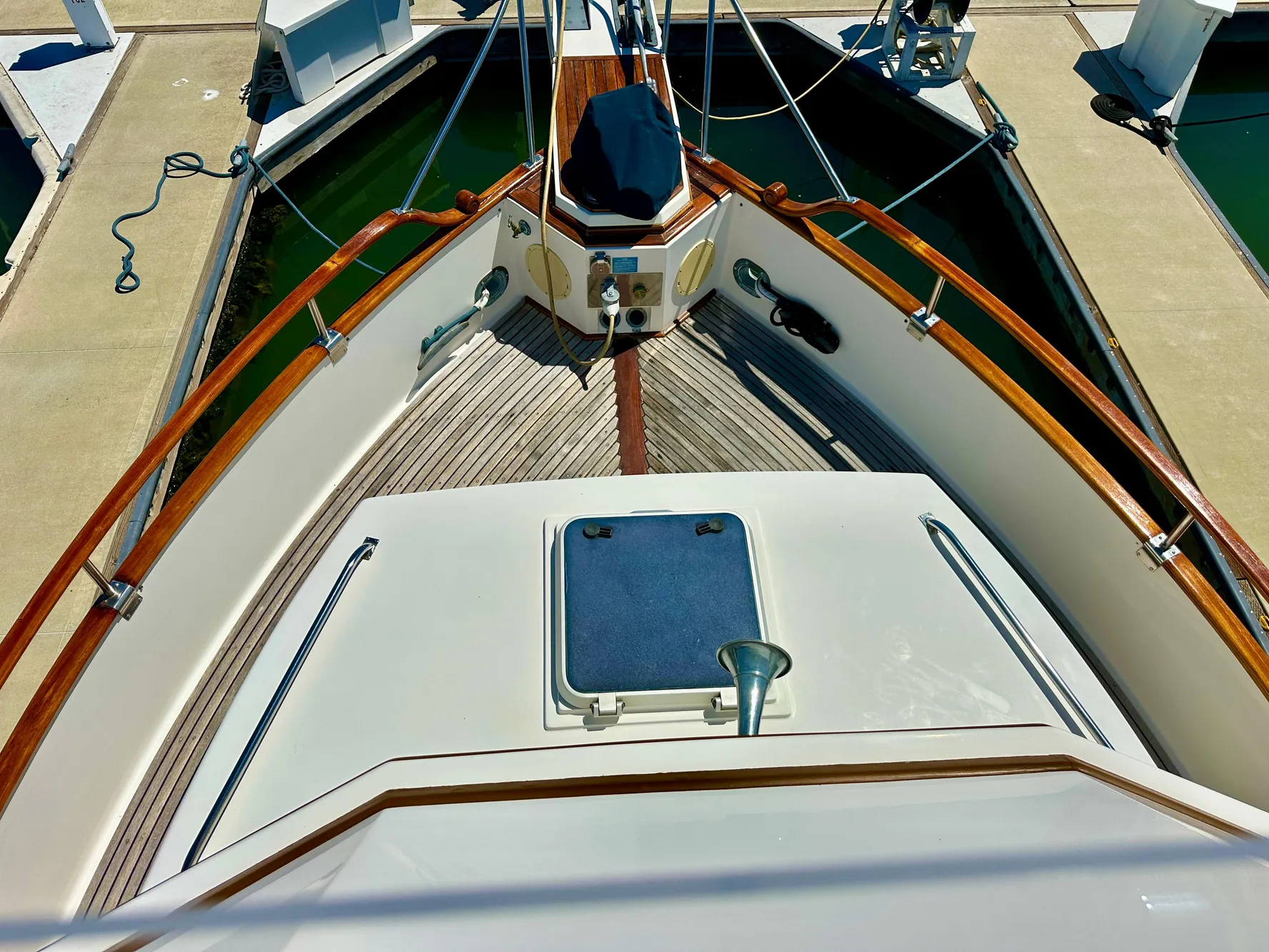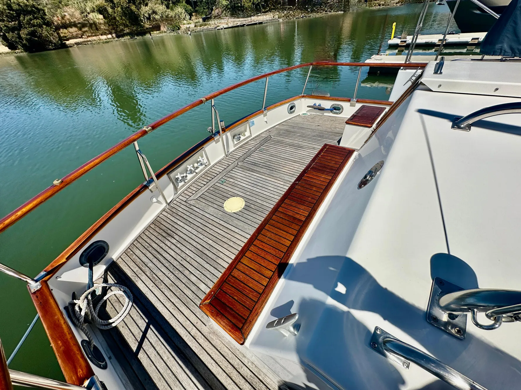 - Stainless steel bow rail and teak handrails